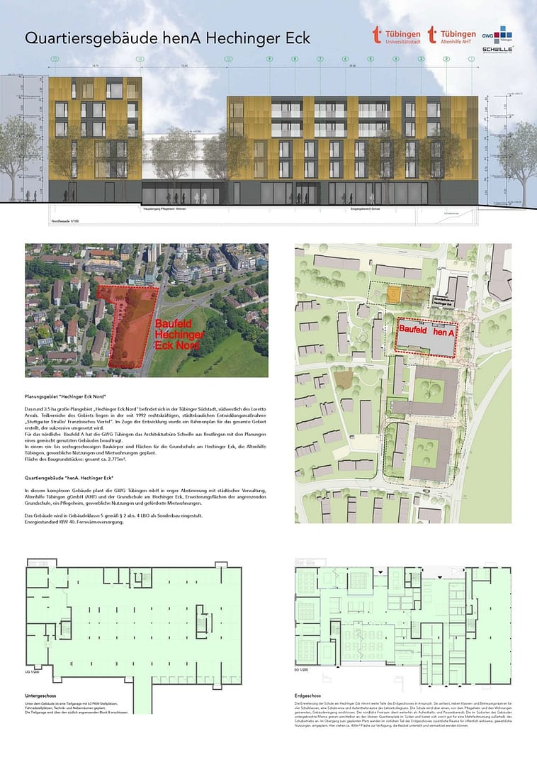 In einem ein- bis sechsgeschossigen Baukörper sind Flächen für die Grundschule am Hechinger Eck, 60 Pflegeplätze für die Altenhilfe Tübingen, gewerbliche Nutzungen und 29 geförderte Mietwohnungen geplant.