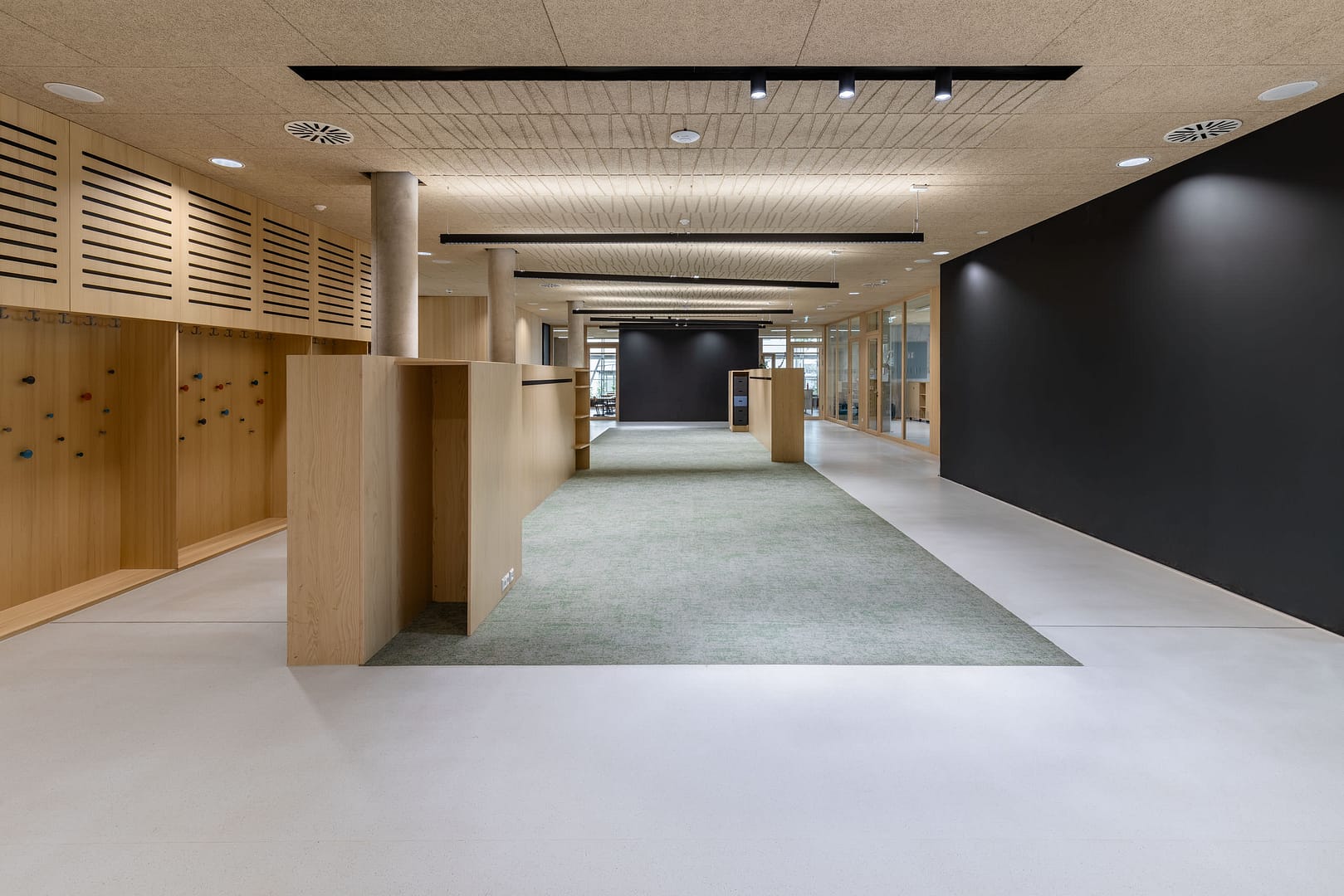 Seine Aufnahmen zeigen, wie offene Erschließungsbereiche, Aufenthaltszonen und Klassenräume zusammenwirken: als klare, robuste Lernumgebung, die zugleich warme Materialien, natürliche Belichtung und ruhige Farben nutzt, um einen einladenden Ort für Schüler:innen und Lehrkräfte zu schaffen.